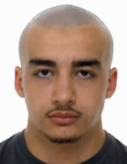 Corpulence mince. Yeux brun foncé. Crâne rasé. Porte un pull gris et un pantalon de jogging noir.