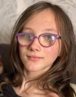 Corpulence mince - Longs cheveux auburn - Yeux bleus - Lunettes mauves - Short en jeans bleu - Blouse noire - Bottes mi-hautes noires - Sac noir