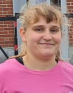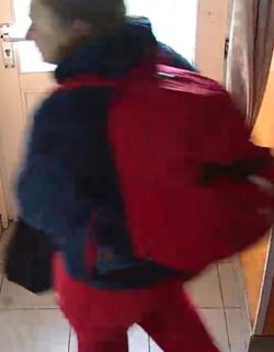 Corpulence forte. Cheveux blonds mi-longs portés en queue de cheval . Vêtements de la marque Nike : pull à capuche bleu foncé, pantalon de training rouge, baskets bleu ciel et deux sacs à dos, un rouge et un noir.