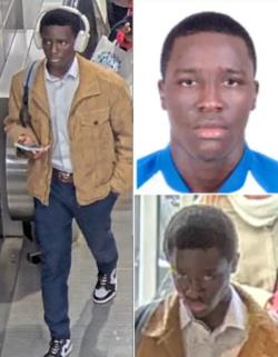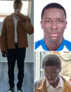 Corpulence normale. Courts cheveux foncés crêpus. Pantalon noir. Chemise blanche. Veste brune claire. Baskets noires et blanches de marque « Nike ».